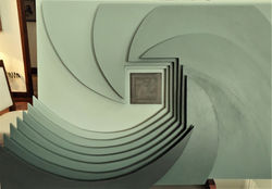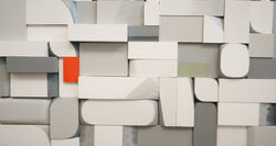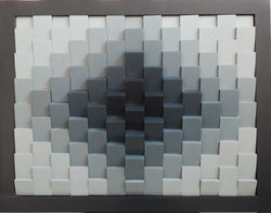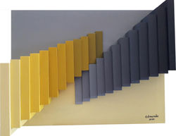 Peças de madeiras, compensados e MDF colados em uma base, realçando a 3ª dimensão e o contraste entre cores, formas e tamanhos.