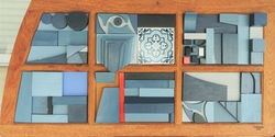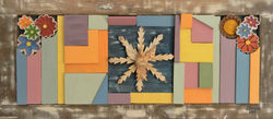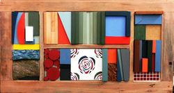 Colagens de materiais diversos tendo como moldura janelas de demolição, destacando as formas, texturas e cores, muitas cores .